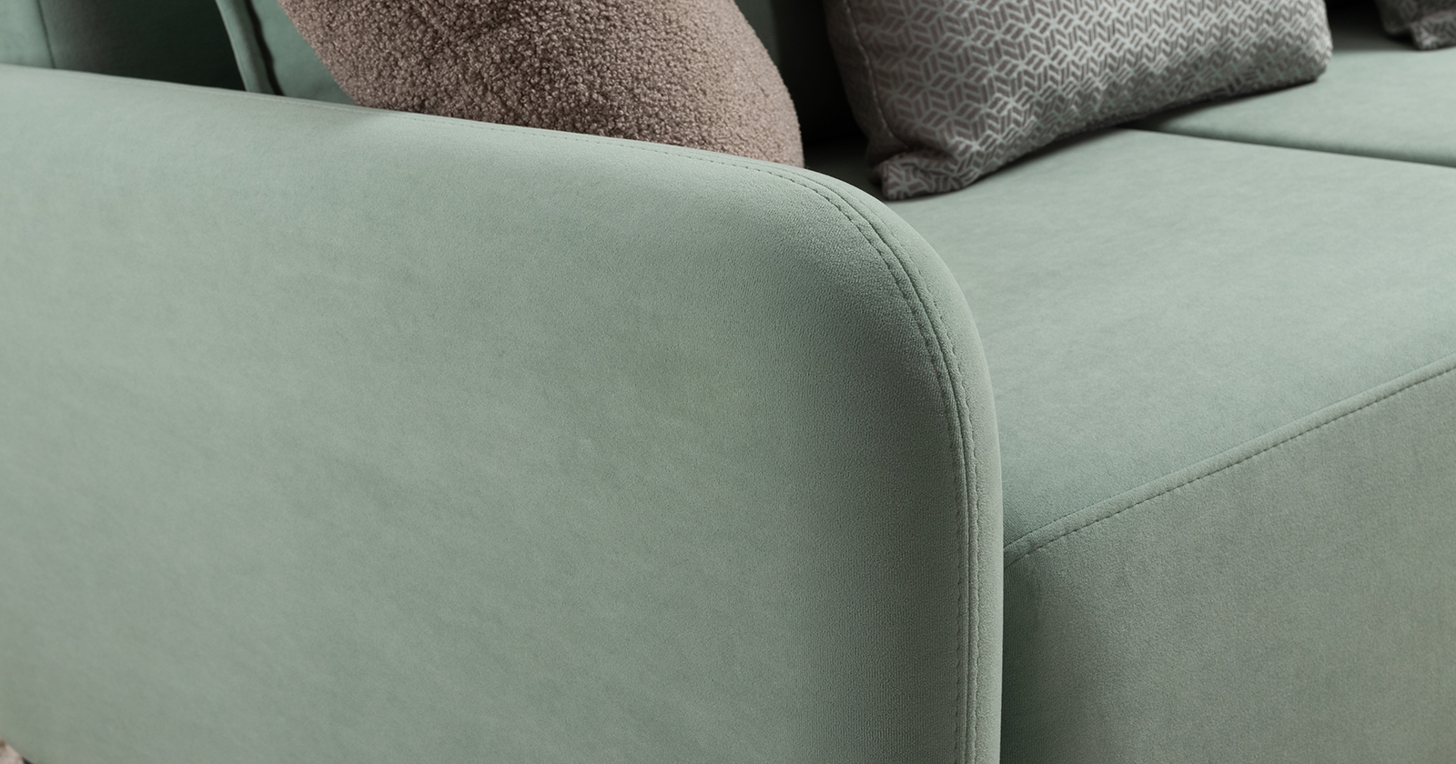 В комплекте 5 двусторонних приспинных подушки и 2 декоративные думки. Задняя спинка в ткани основы. Декоративные отделочные строчки по боковинам и сиденью