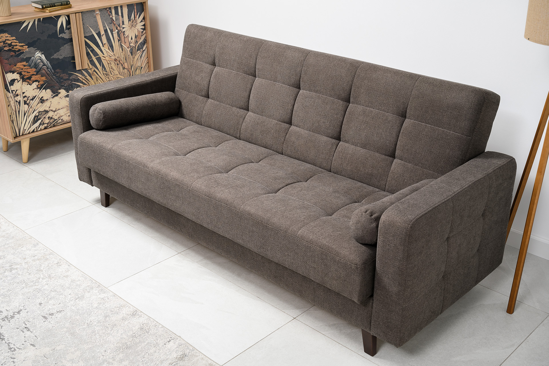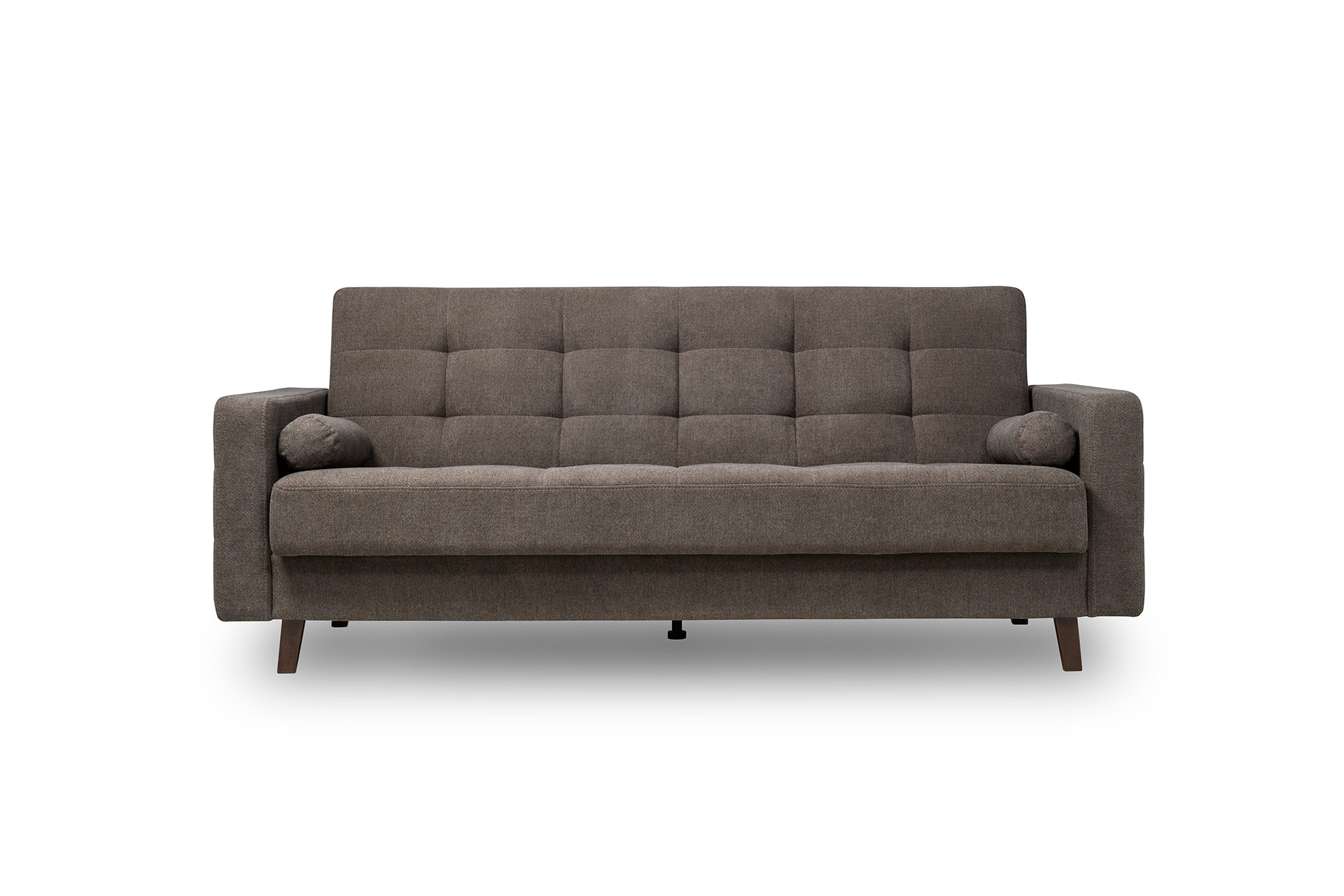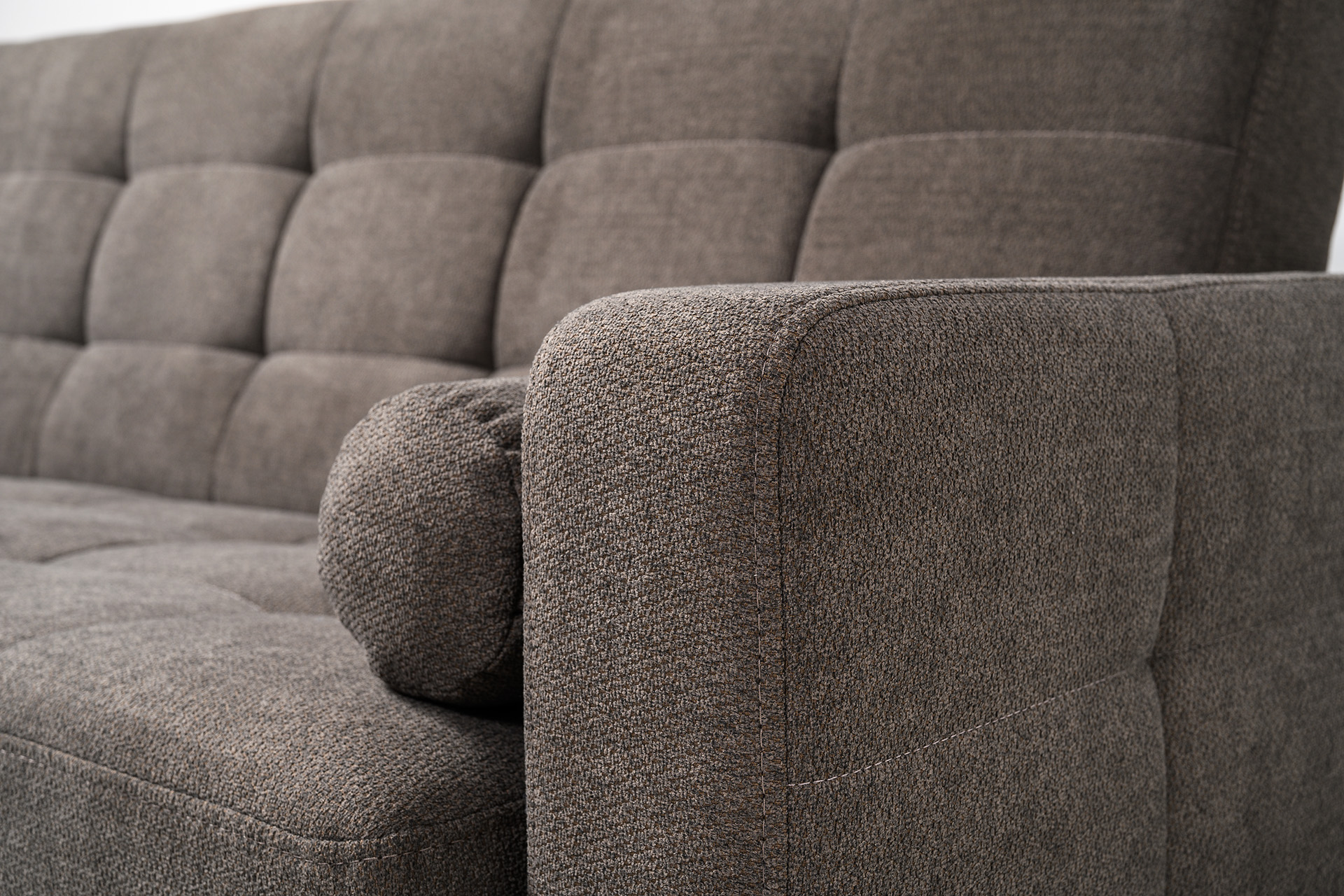 Прямоугольная стежка по спинке, посадочному месту и подлокотниках, круглые подушки-валики