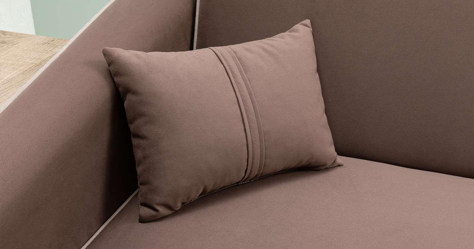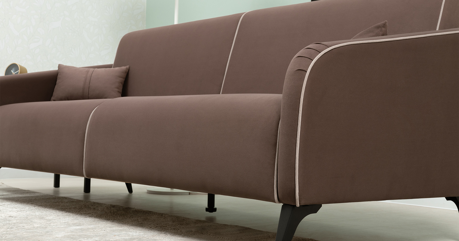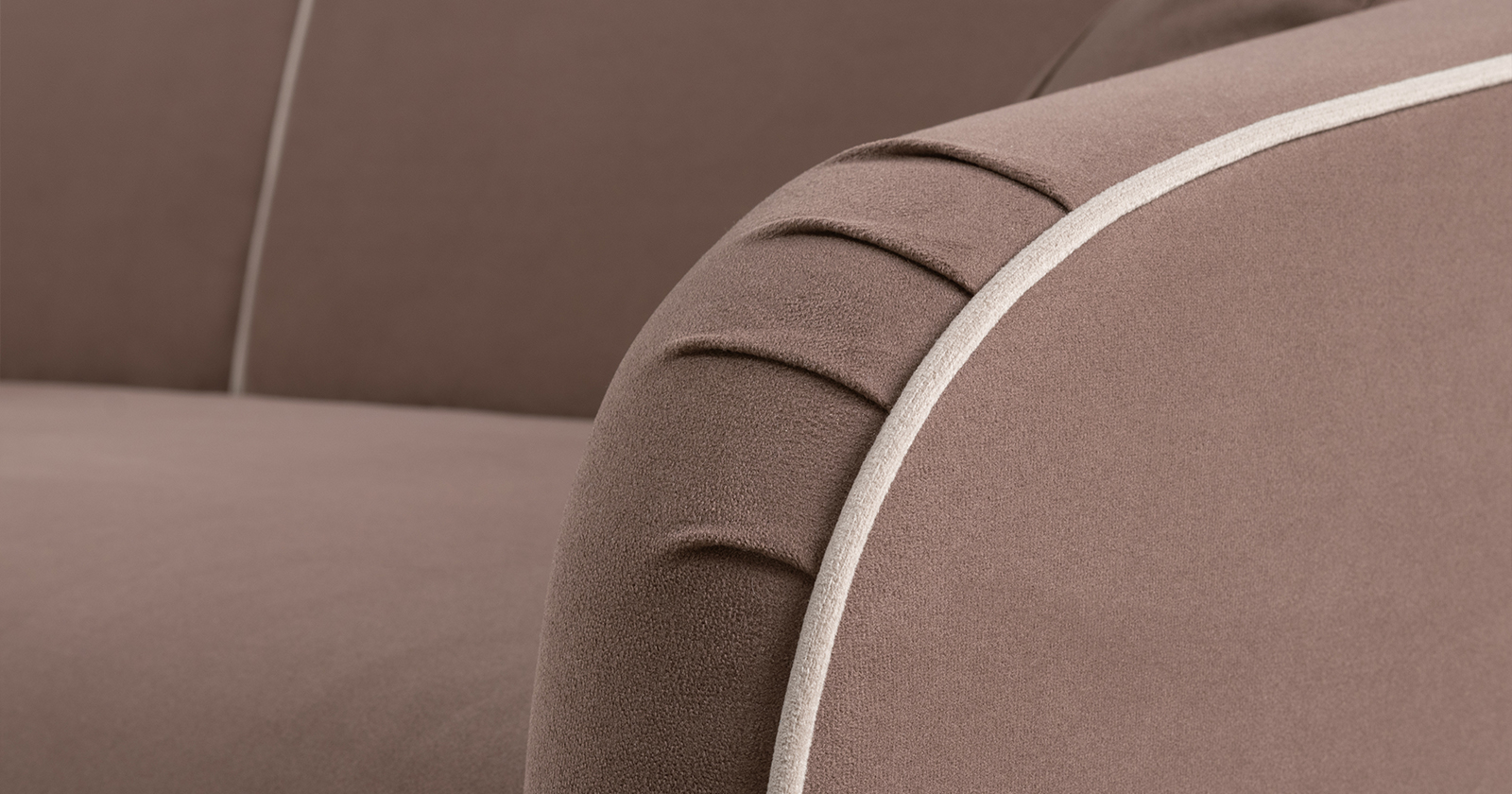 Спинка и сиденье разделяются пополам двойным кантом по центру и одинарным по краям сидения, для придания одной единой формы. Подлокотники с изгибом на лицевой стороне и мягкими закругленным углом со складками, с выраженным контрастным ровным кантом по внешнему контуру изделия и изогнутой линией канта.