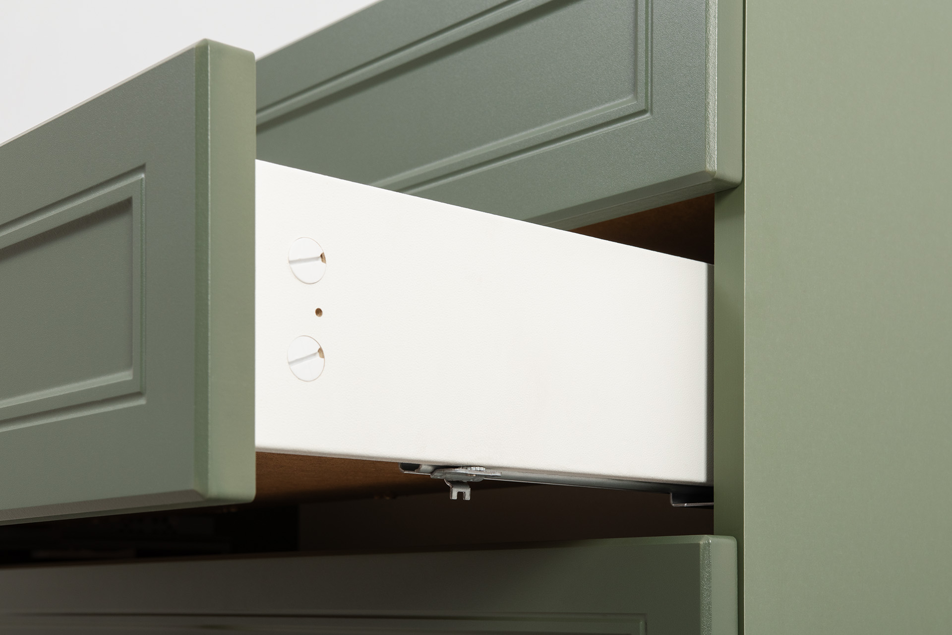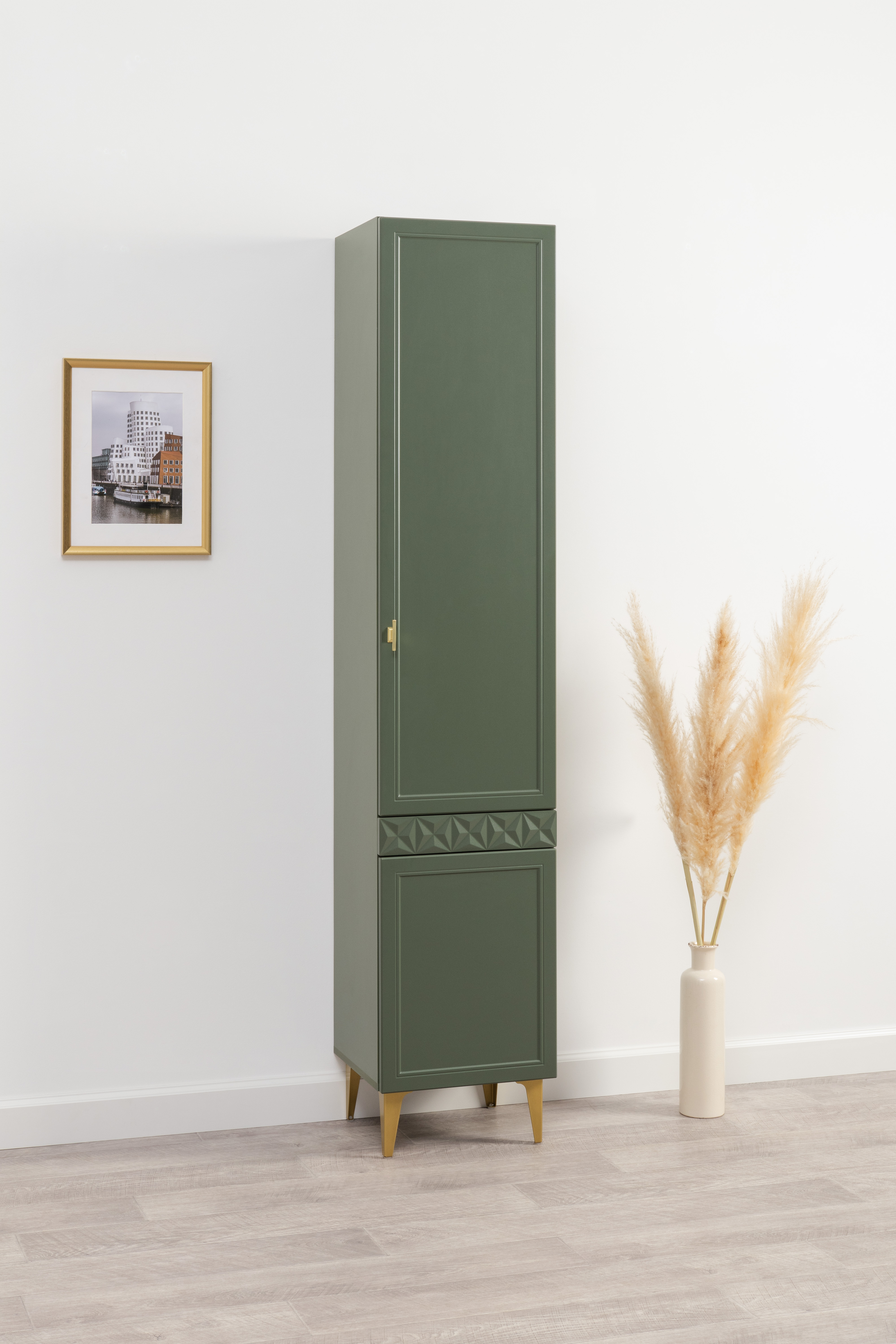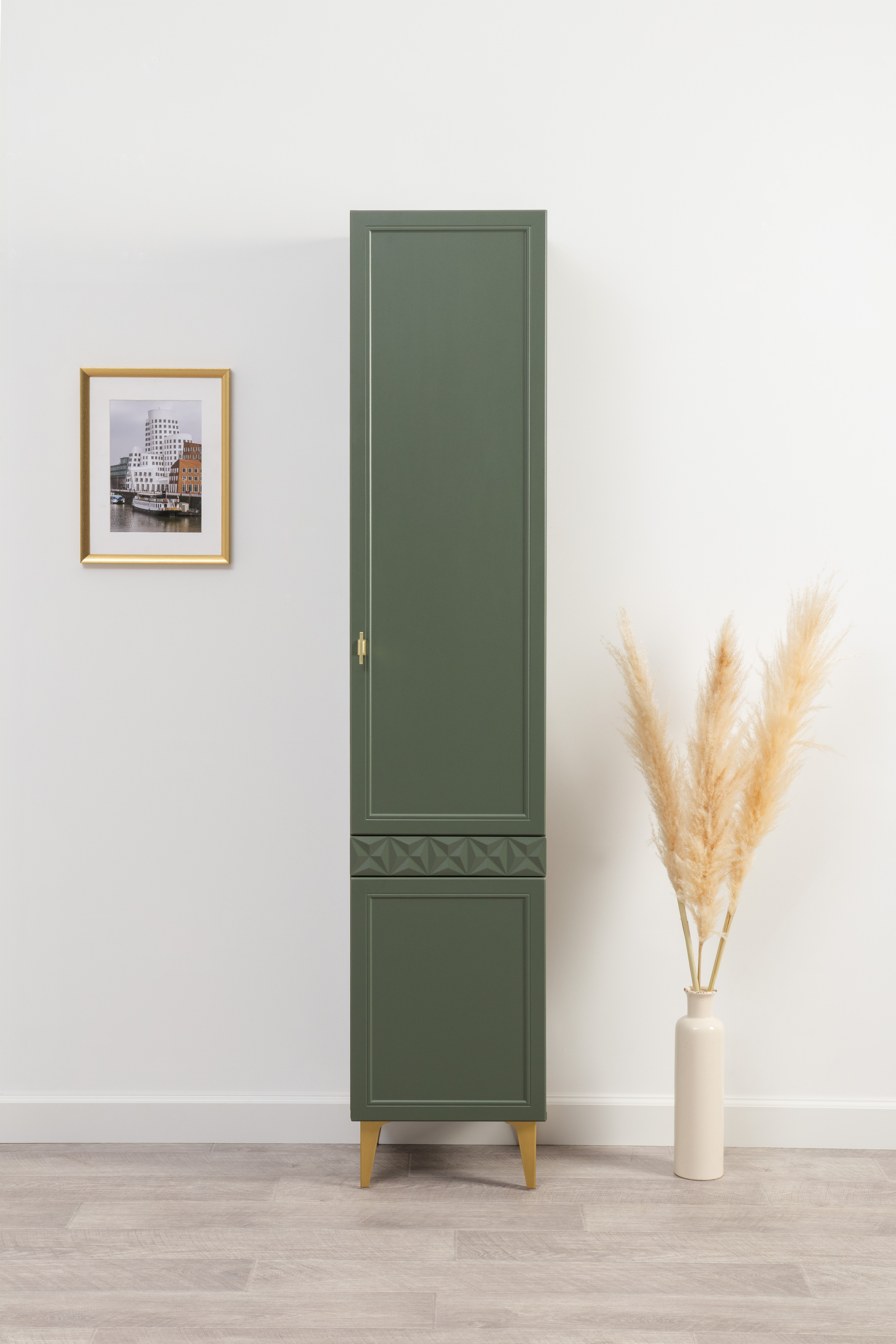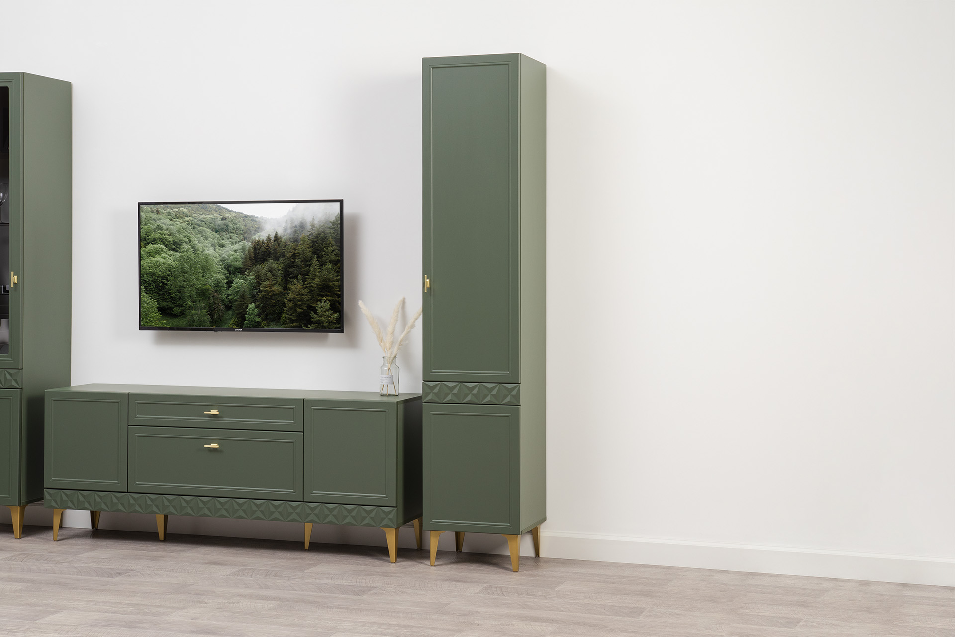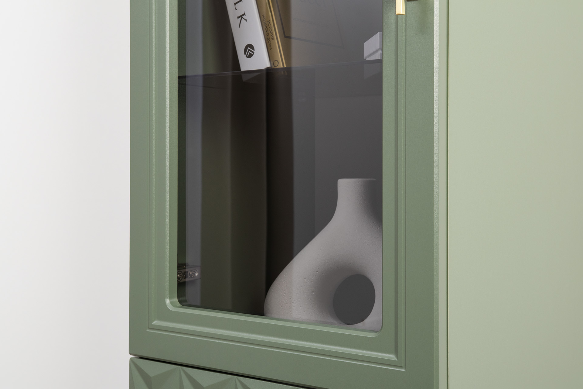 Изящные линии, глубокая фрезеровка фасадов из МДФ и благородные оттенки. Утончённая «Слоновая кость» и изысканная «Олива Шагрень» с глубоким зелёным тоном — создают атмосферу уюта, тепла и благородства. Металлические ручки и опоры золотого цвета придают мебели утончённый блеск, а петли и направляющие с доводчиками обеспечивают плавное и бесшумное закрытие фасадов.