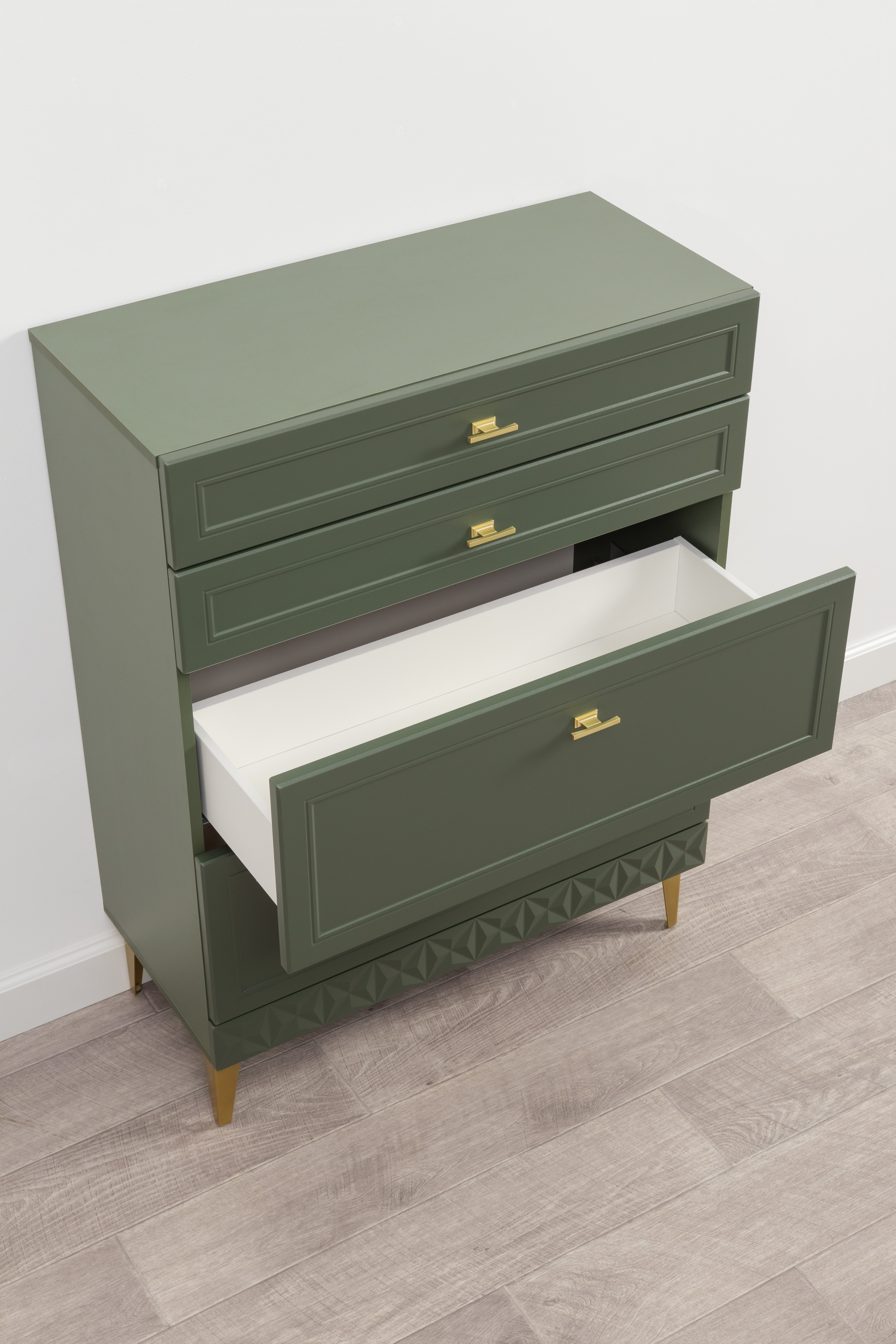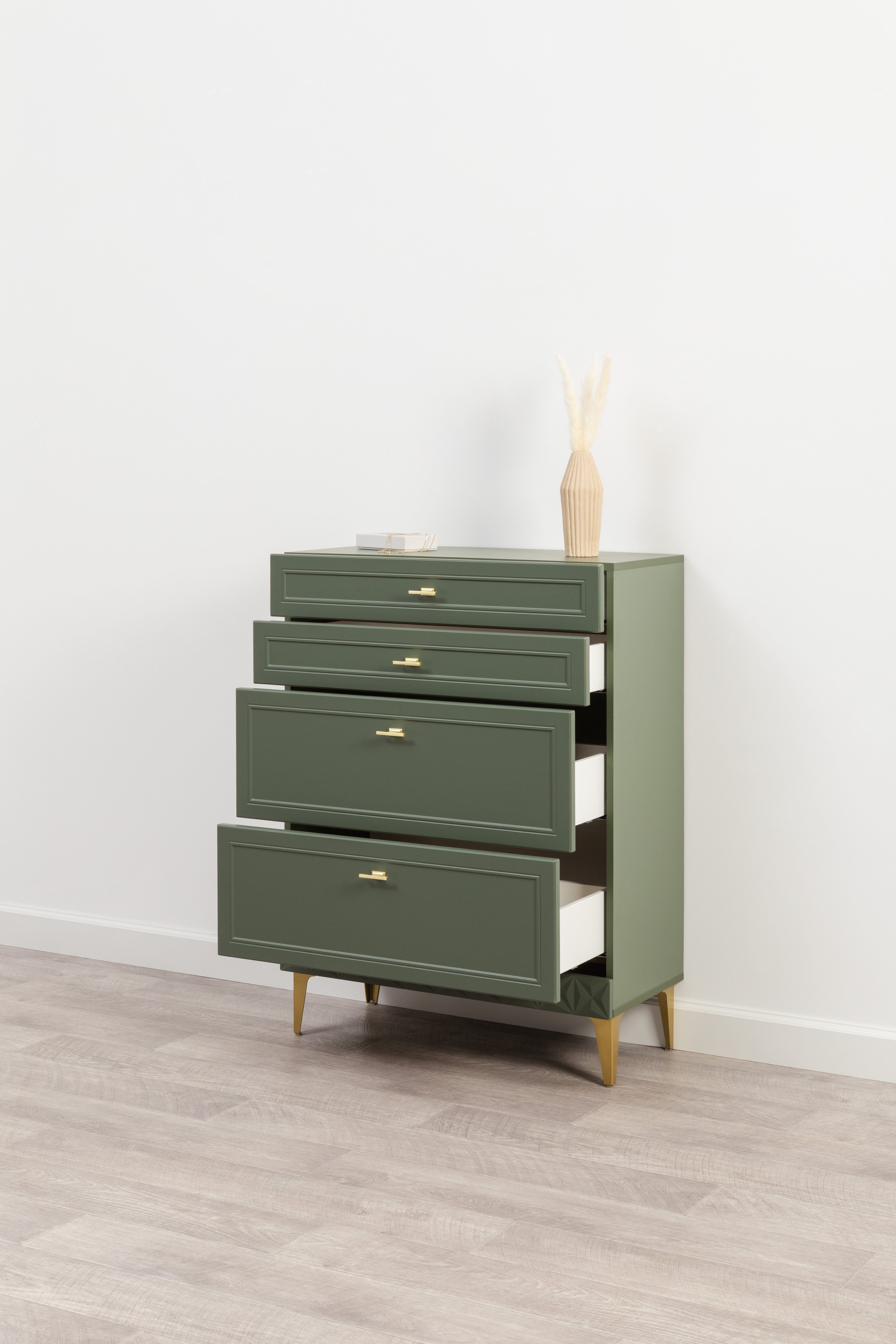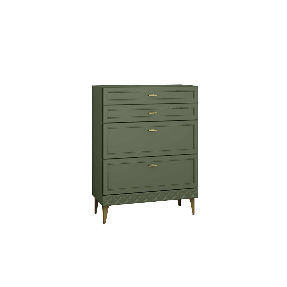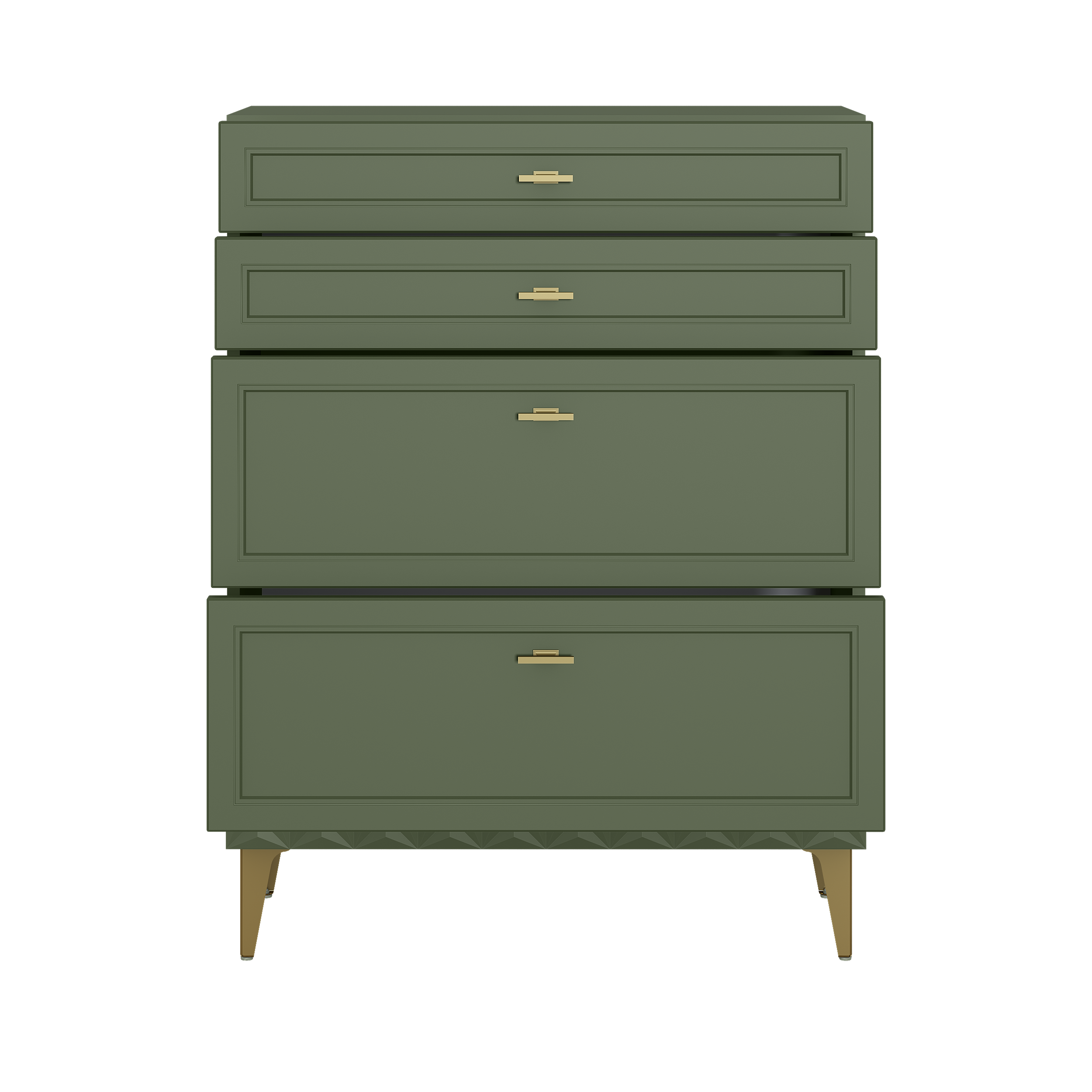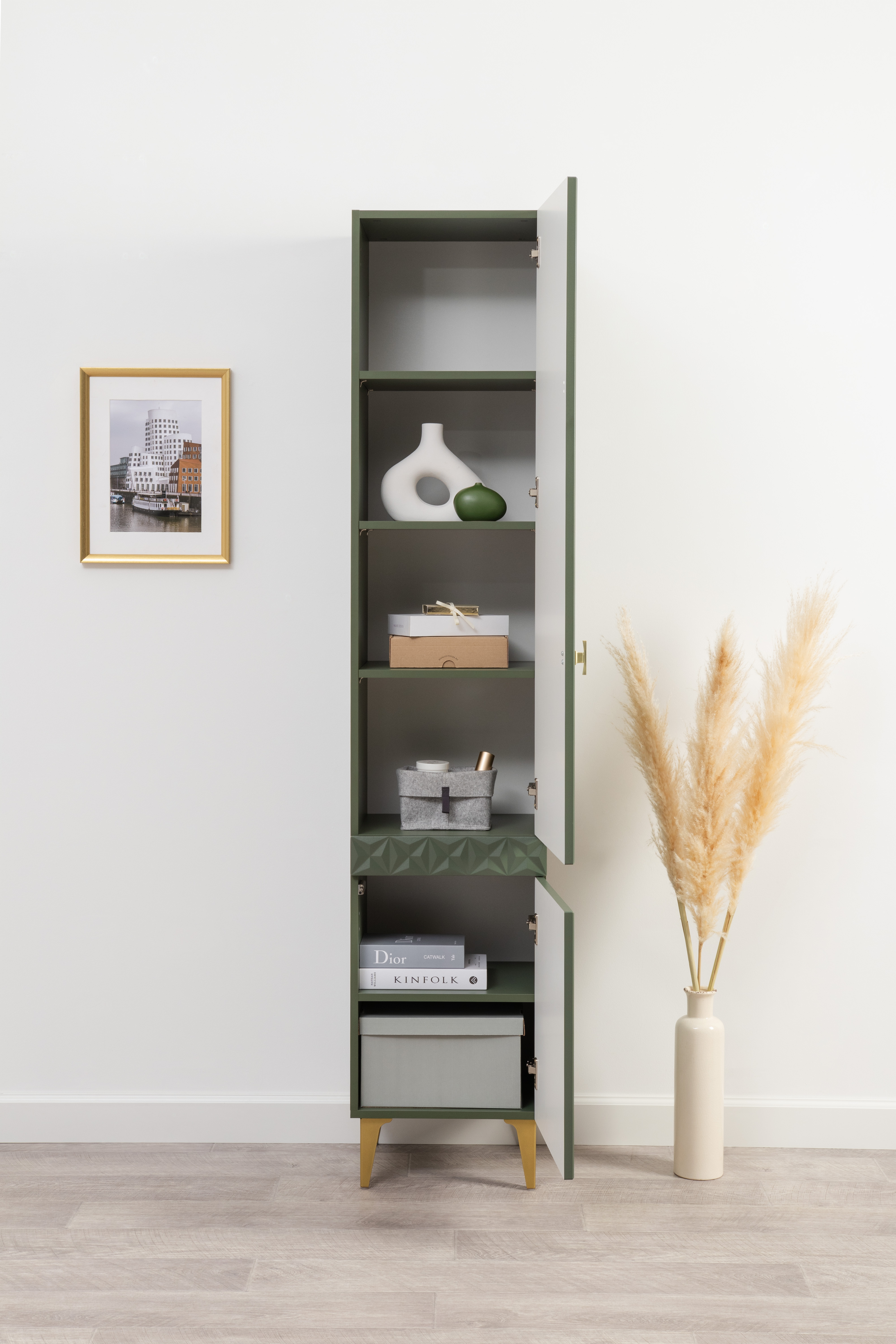 Изящные линии, глубокая фрезеровка фасадов из МДФ и благородные оттенки. Утончённая «Слоновая кость» и изысканная «Олива Шагрень» с глубоким зелёным тоном — создают атмосферу уюта, тепла и благородства. Металлические ручки и опоры золотого цвета придают мебели утончённый блеск, а петли и направляющие с доводчиками обеспечивают плавное и бесшумное закрытие фасадов.