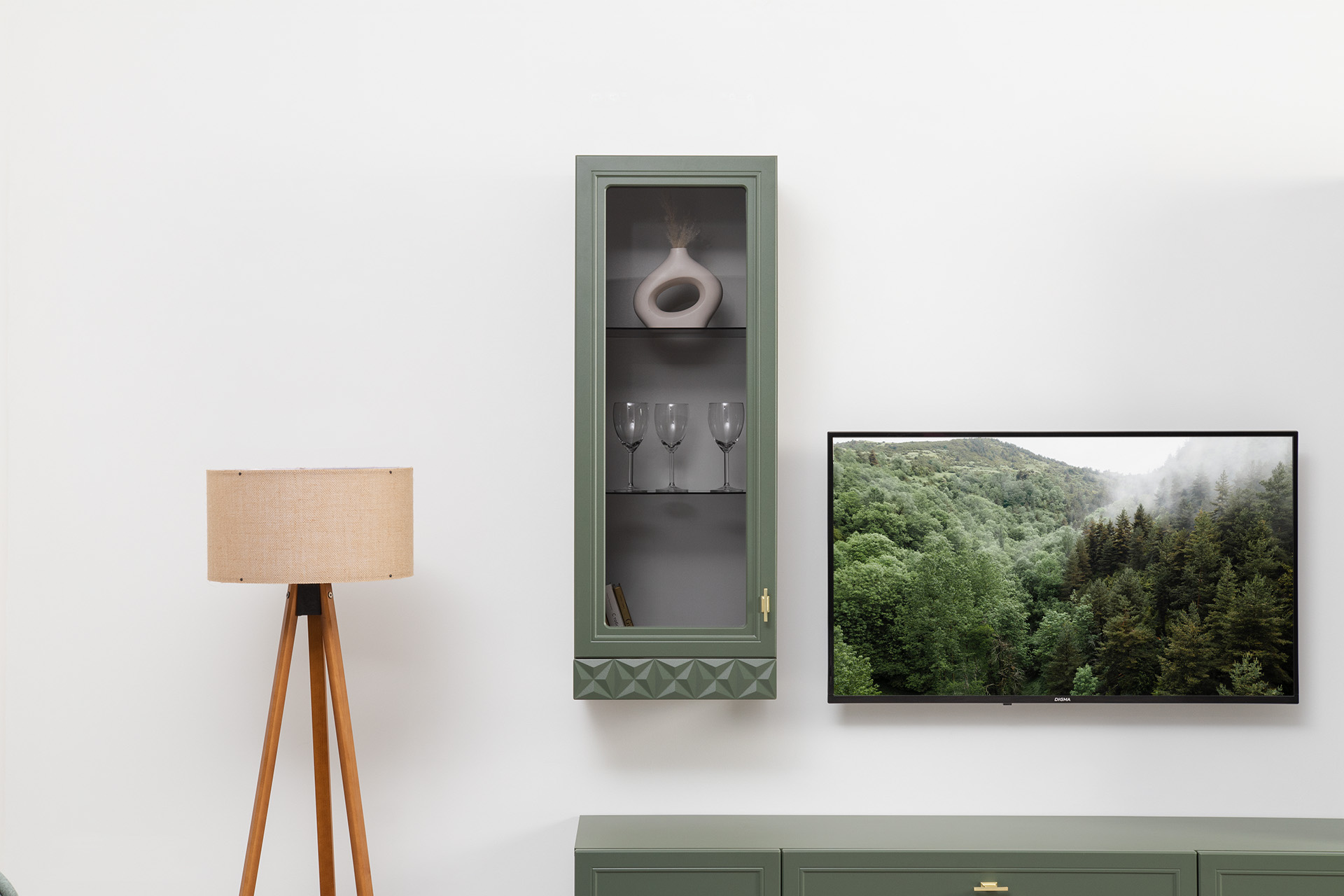 Шкаф-витрина Марион 16.397.01 дымчатый зеленый K521, олива шагрень AG 1050 ПВХ (собирается на любую сторону)