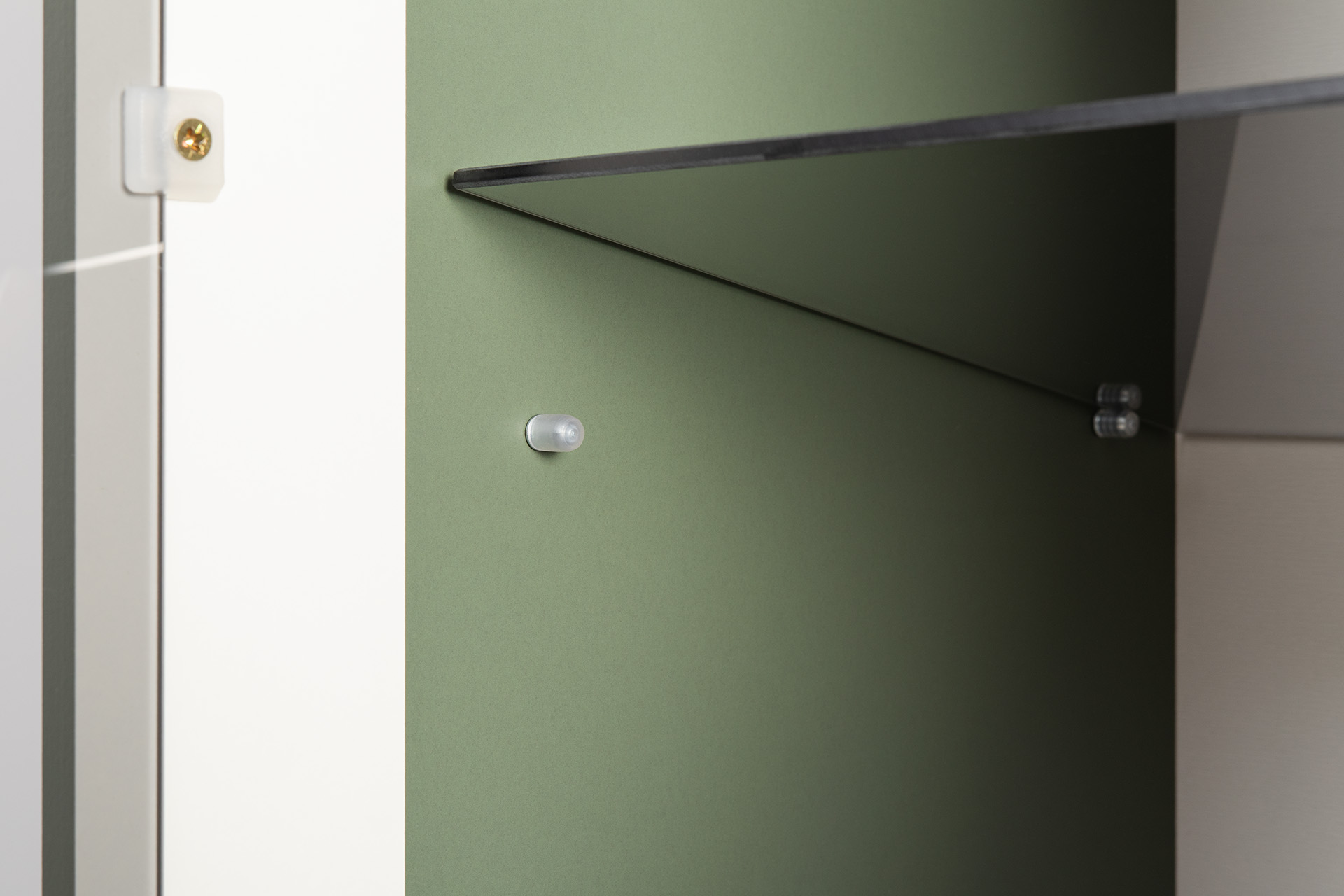 Гостиная Марион композиция 2 дымчатый зеленый K521, олива шагрень AG 1050 ПВХ, белый PE шагрень (собирается на любую сторону)