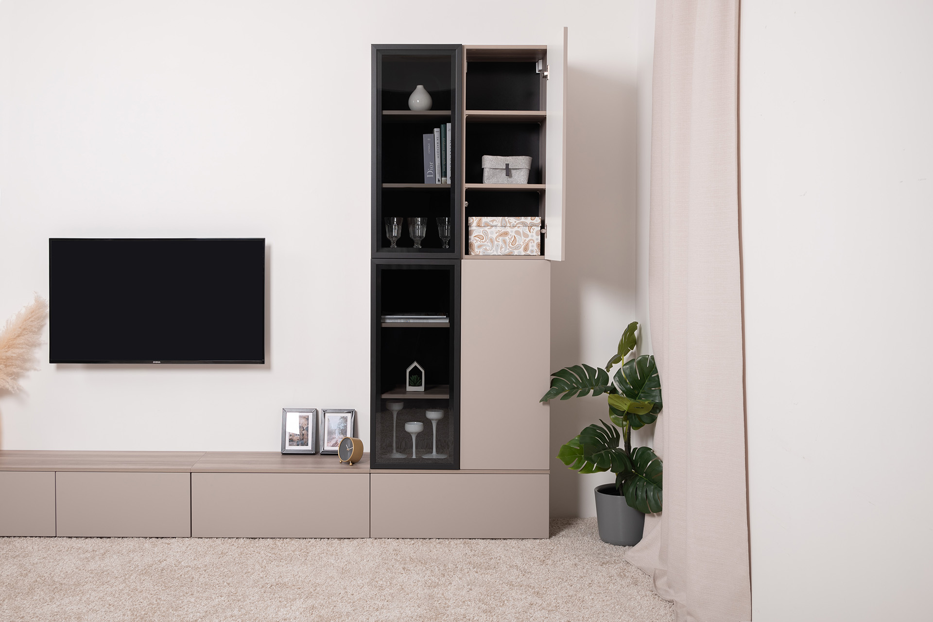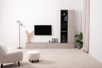 Разнообразие модулей и возможность их напольной и настенной установки позволит создать гостиную оптимальной конфигурации. Распашные фасады с механизмом push-to-open, направляющие скрытого монтажа в ящиках, петли с доводчиками, регулируемые опоры, крепеж в комплекте – комфорт продуман до мелочей.