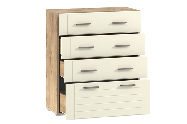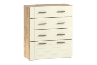 Комод Livorno НМ 040.46 идеально впишется в интерьер современной гостиной или спальни. Модуль оснащен четырьмя вместительными ящиками, плавный ход которых обеспечивают шариковые направляющие полного выдвижения. Верхние ящики меньше нижнего, поэтому подходят для хранения более легких вещей. На фасадах предусмотрено по две ручки, что обеспечивает максимально удобное открывание ящиков.