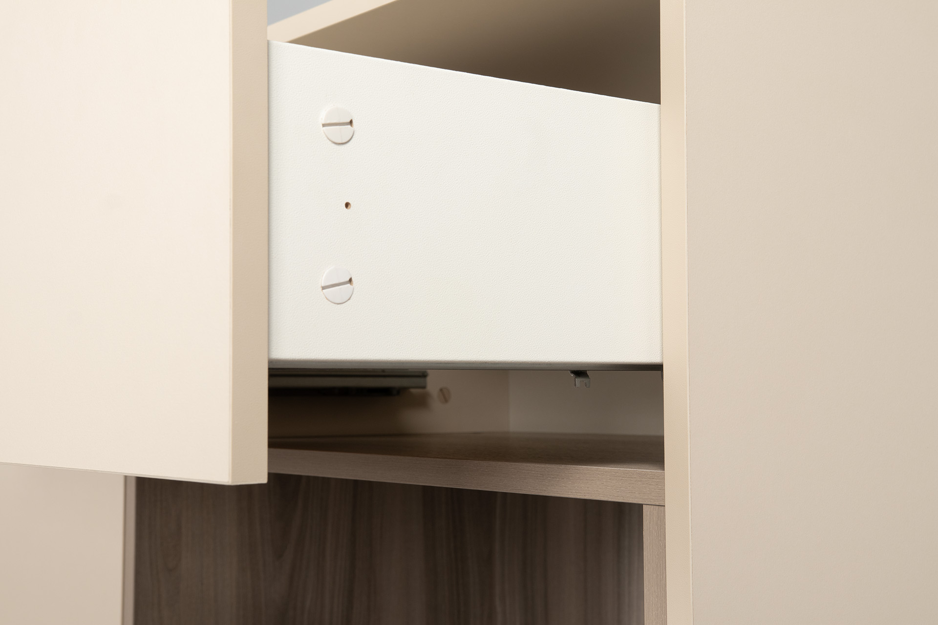 Фасады с механизмом push-to-open, направляющие скрытого монтажа, петли с доводчиками, утолщённая кромка – комфорт продуман до мелочей.