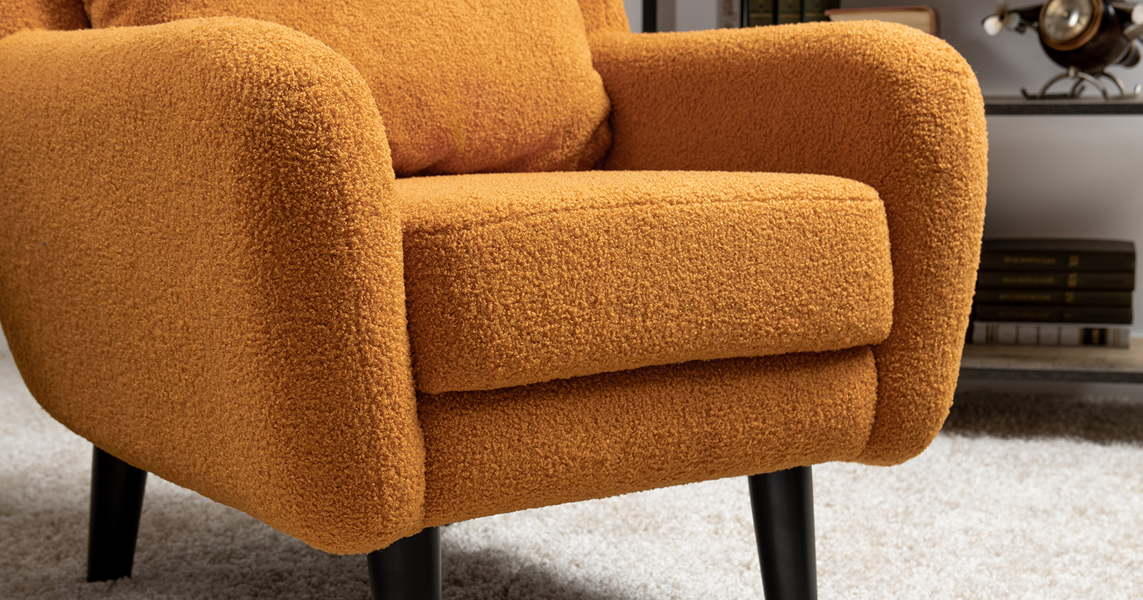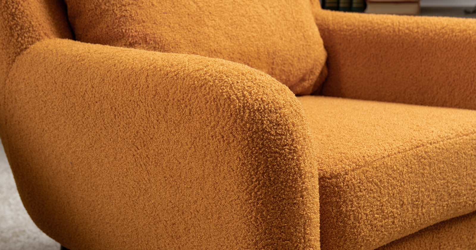 Ткань букле делает кресло особенно уютным и мягким. Приспинная подушка в цвете кресла