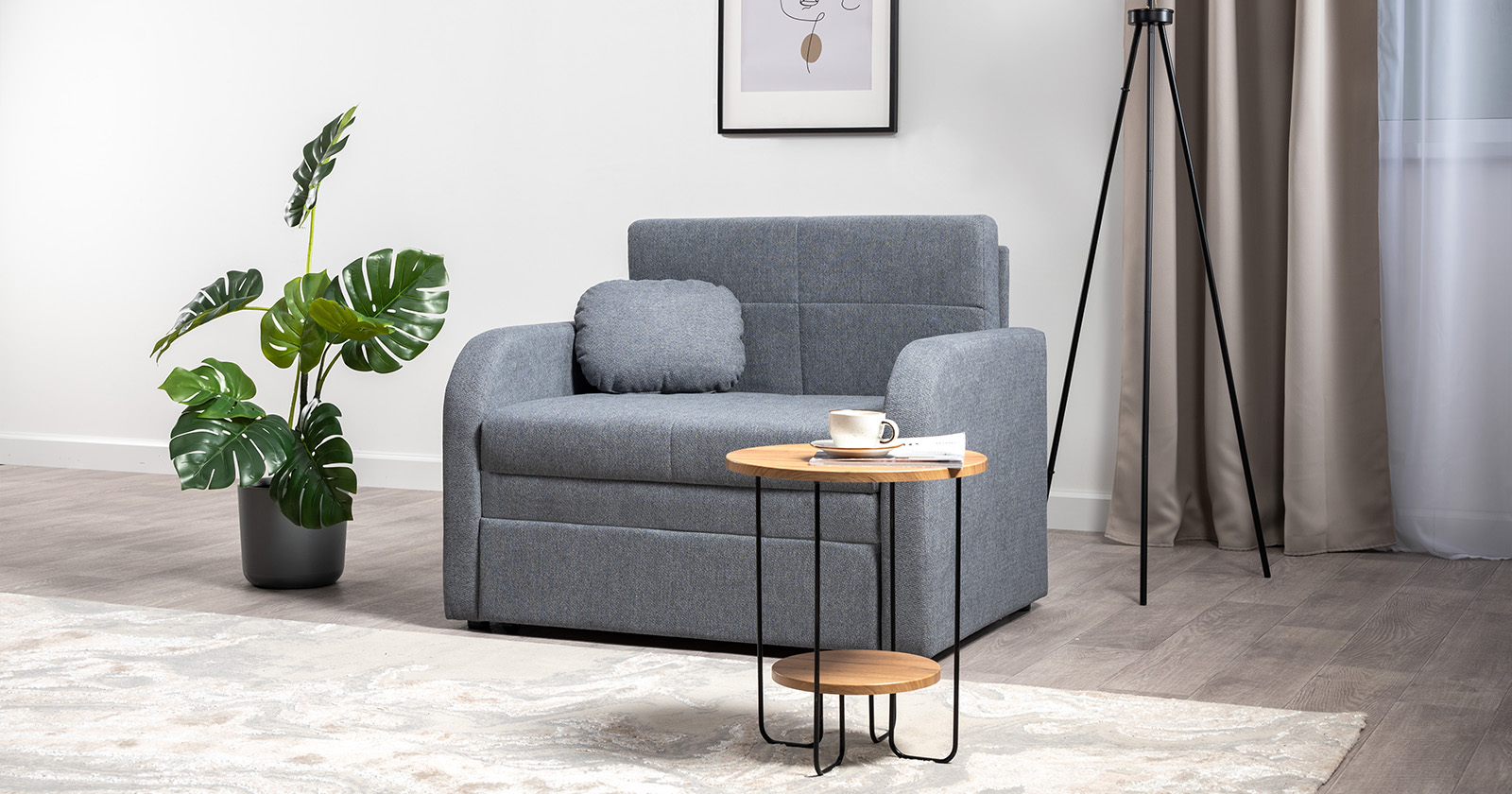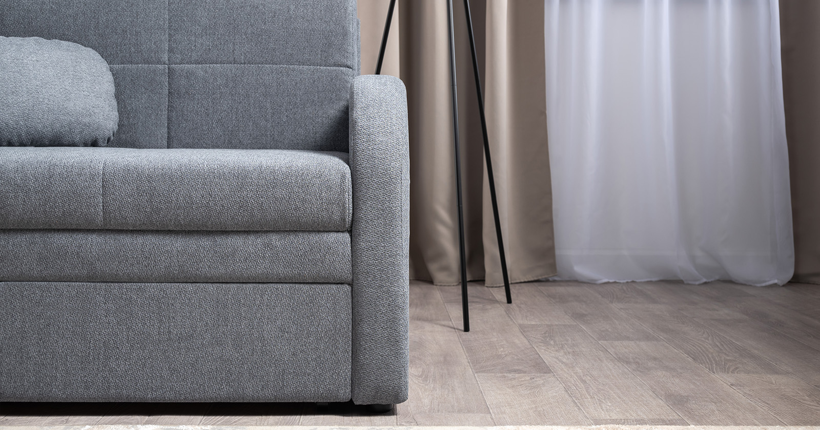 Коллекция выполнена в современном минималистичном стиле с мягкой обивкой из износостойкой ткани и декоративной стежкой, подчеркивающей геометрию форм. Механизм трансформации обеспечивает дополнительное спальное место, делая мебель не только эстетичной, но и максимально функциональной для небольших пространств.