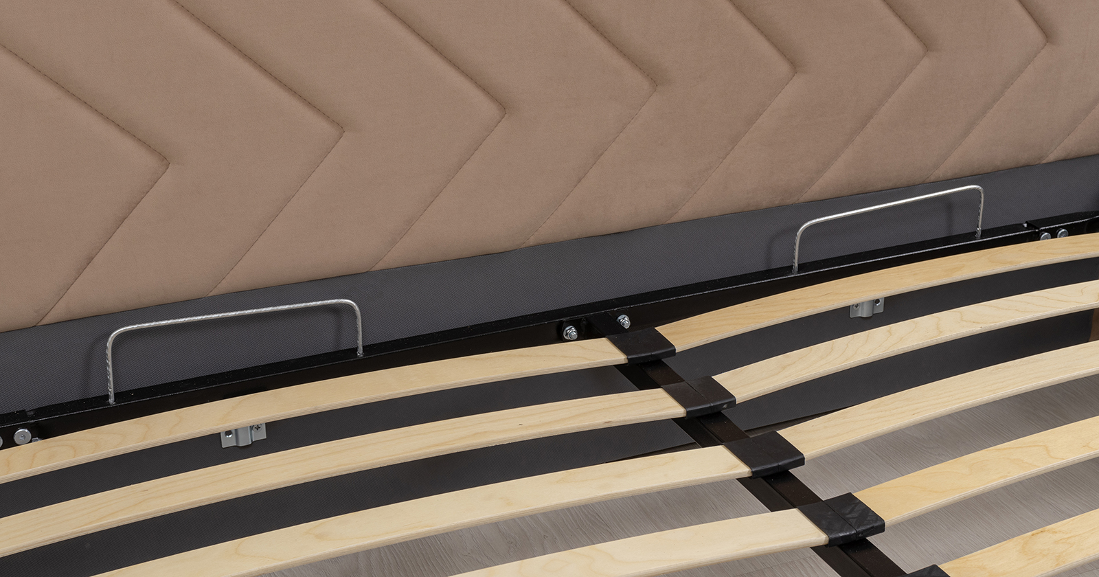 Основание кровати укомплектовано матрасодержателями. Жесткое кроватное дно из ЛДСП 16 мм. Задняя стенка изголовья выполнена в тех. ткани (спанбонд).