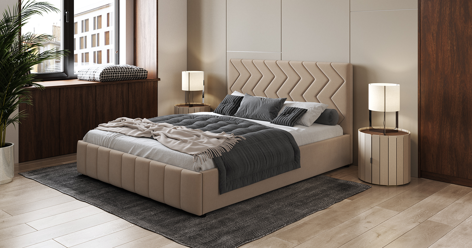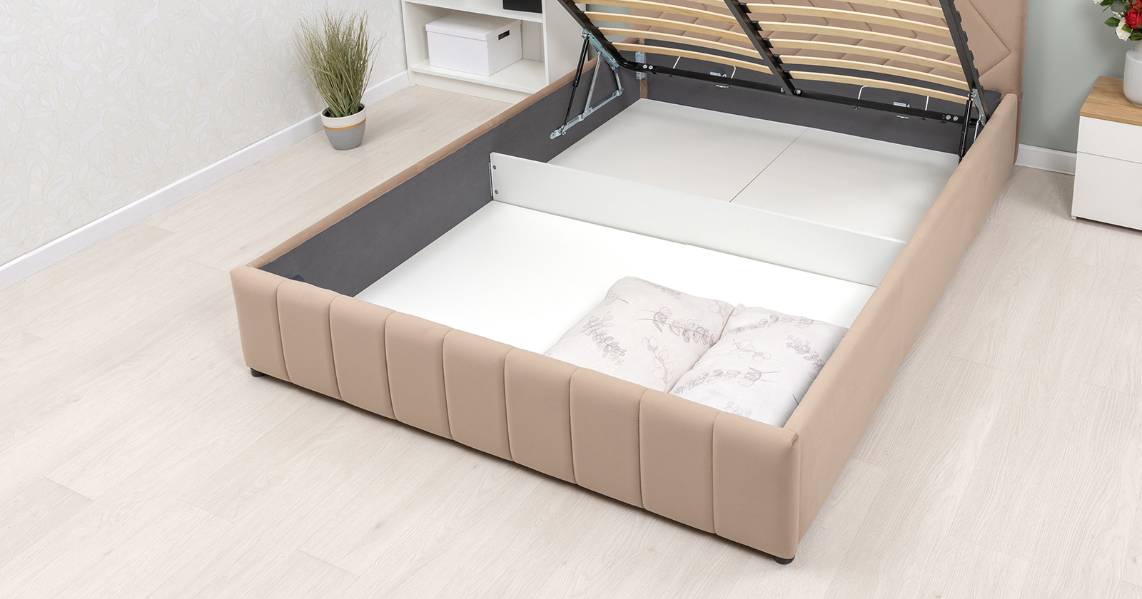 Кровать Милана 160 велюр бежевый кофейный с ортопедическим основанием и подъемным механизмом