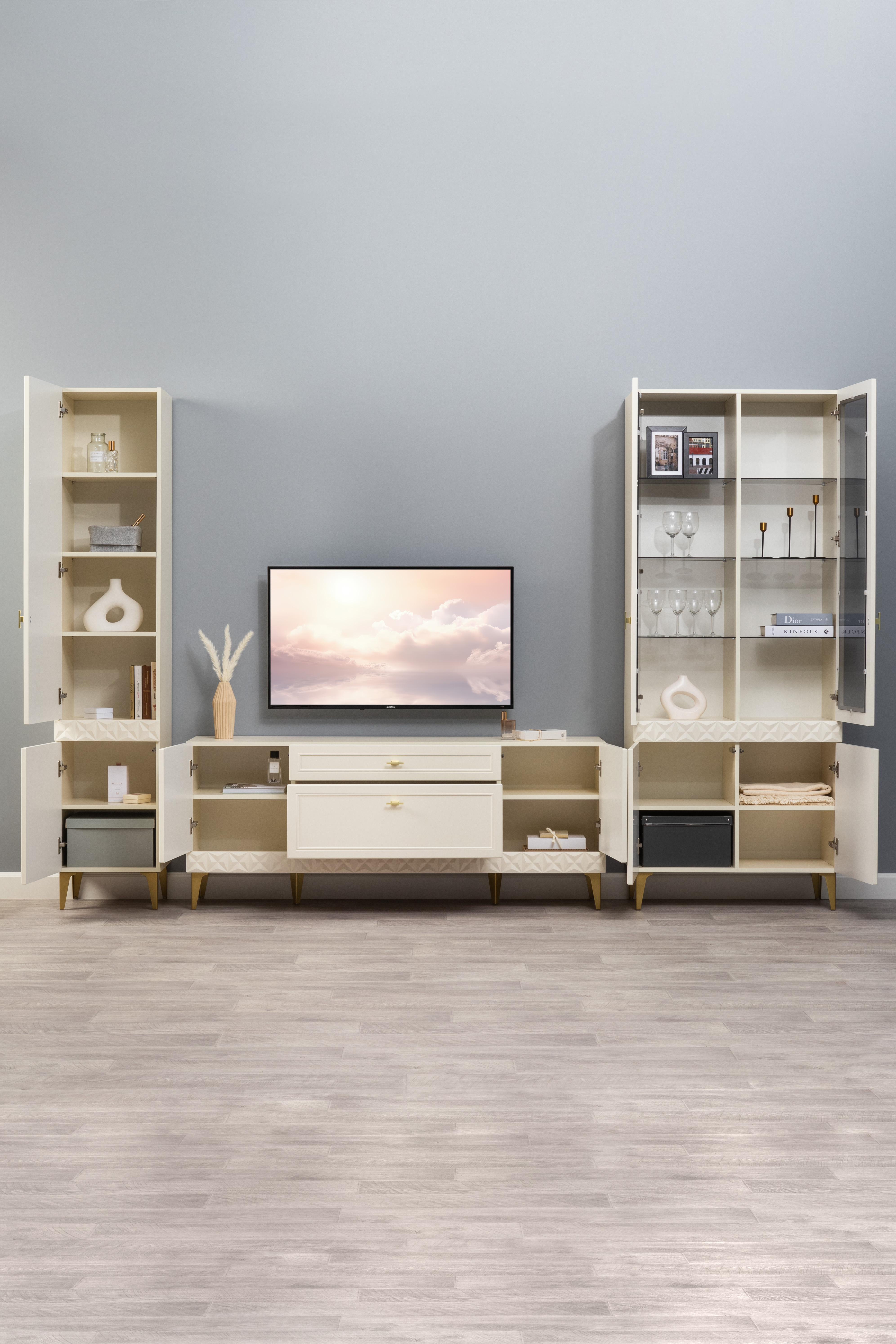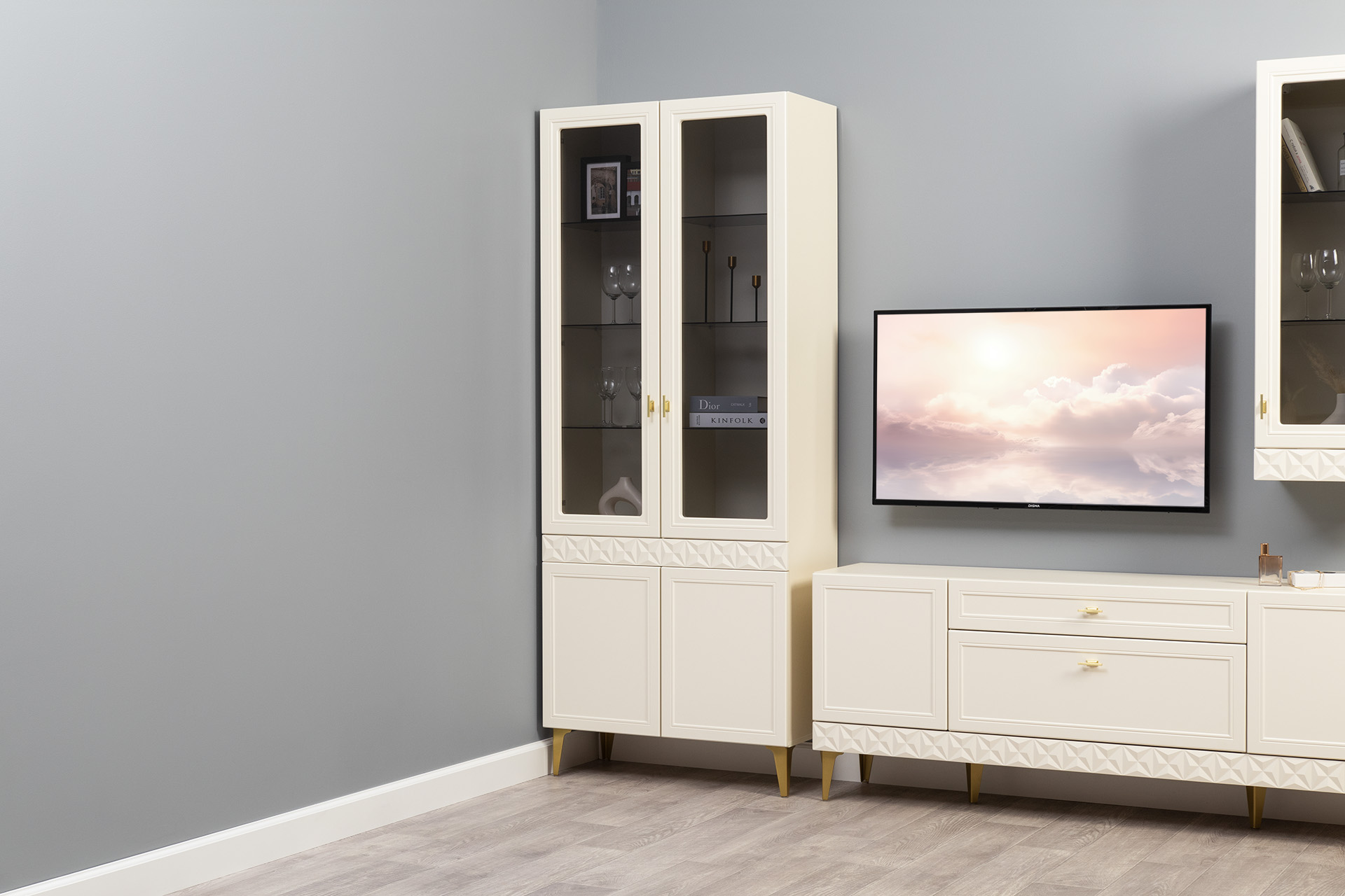 В коллекции представлены три типа витрин с тонированным закалённым стеклом, которые придают пространству лёгкость и свет. «Марион» — идеальное сочетание традиций и актуального дизайна в каждой детали.