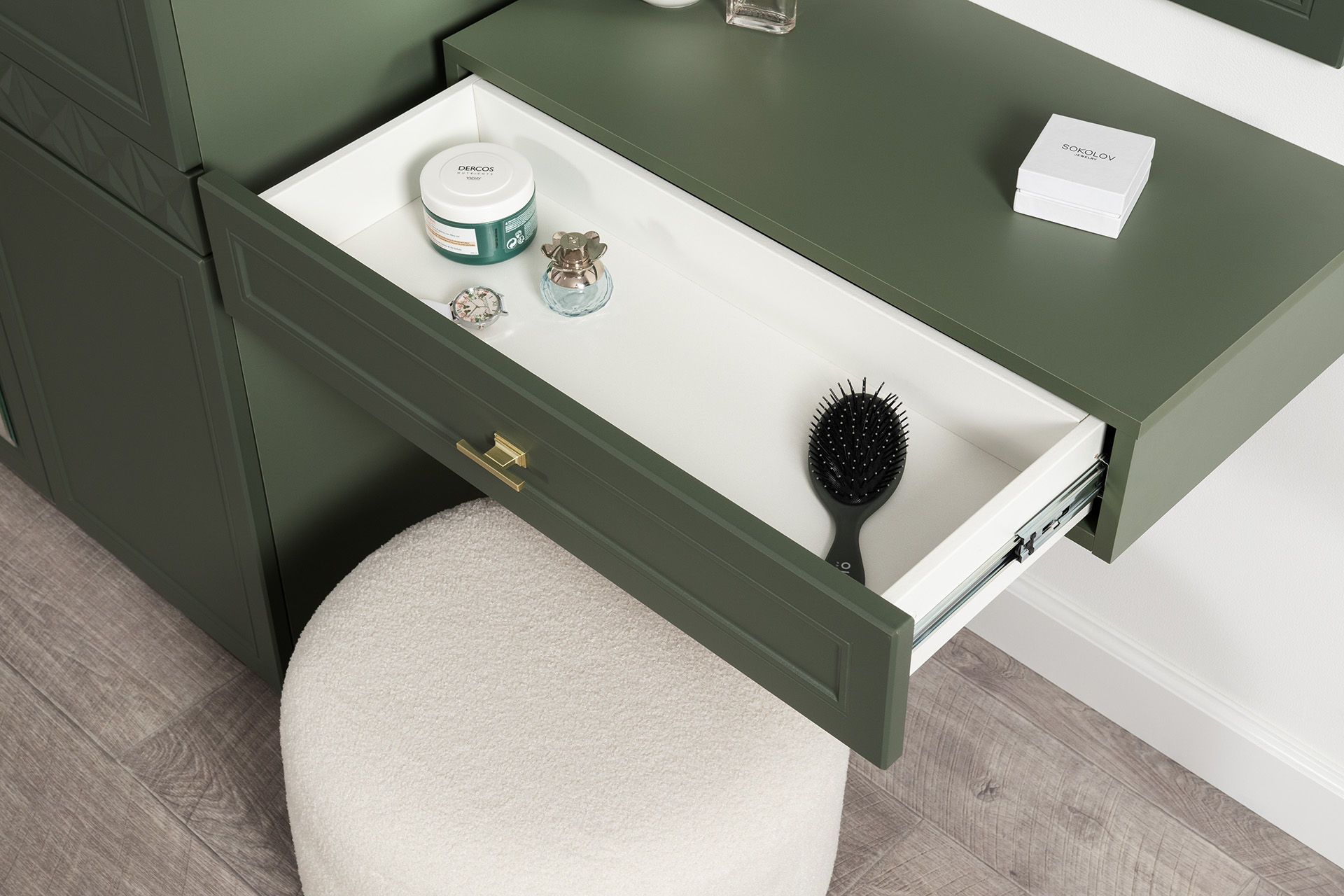 Изящные линии, глубокая фрезеровка фасадов из МДФ и благородные оттенки. Утончённая «Слоновая кость» и изысканная «Олива Шагрень» с глубоким зелёным тоном — создают атмосферу уюта, тепла и благородства. Металлические ручки и опоры золотого цвета придают мебели утончённый блеск, а петли и направляющие с доводчиками обеспечивают плавное и бесшумное закрытие фасадов.