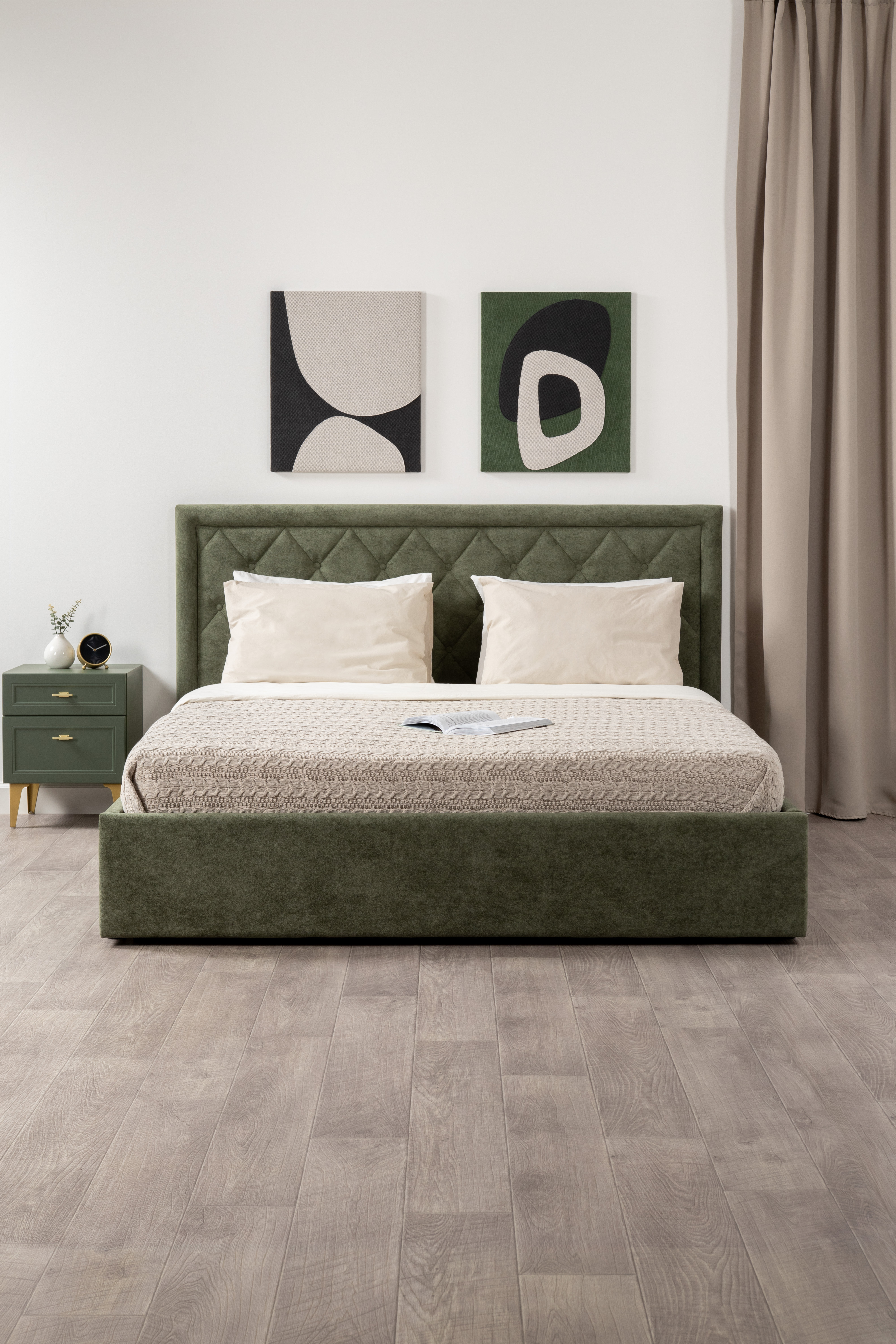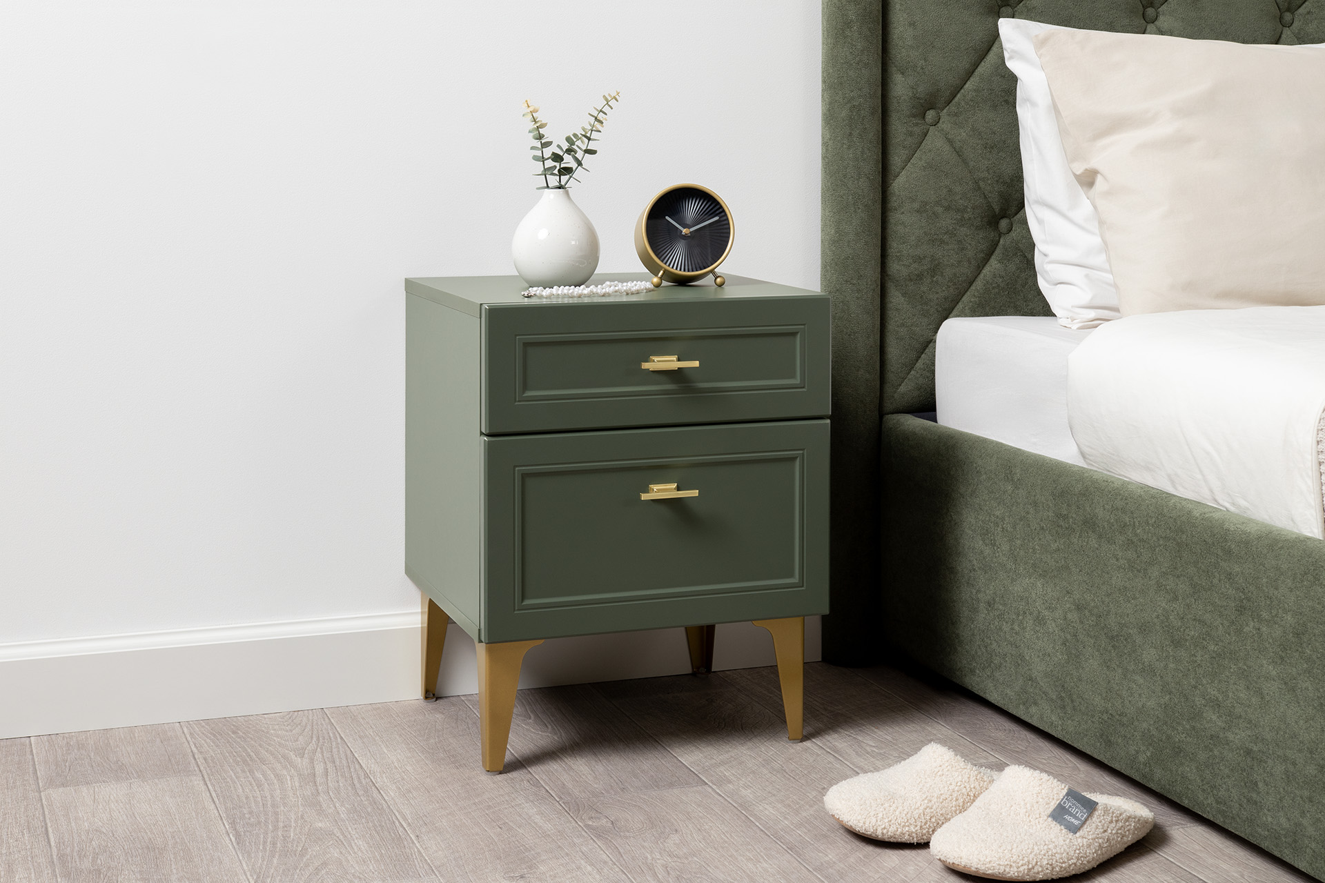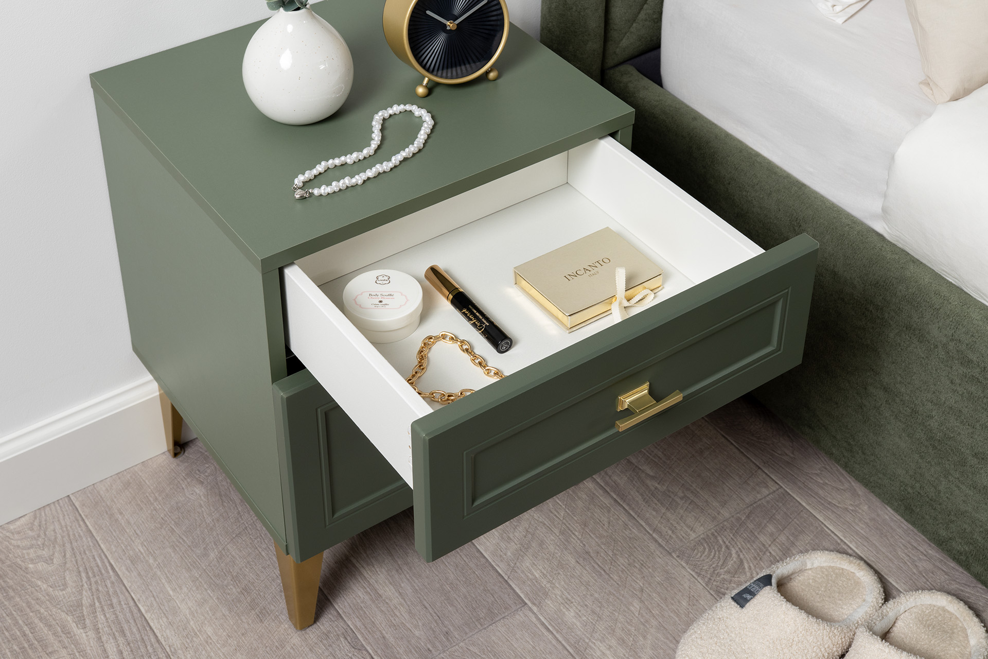 Тумба прикроватная Марион 16.14 дымчатый зеленый K521, олива шагрень AG 1050 ПВХ, белый PE шагрень